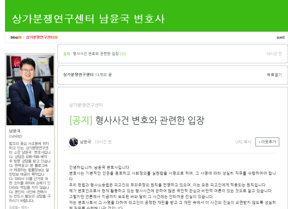 이런 그의 입장문 발표에 댓글이 수천 개 달리면서 관심을 얻고 있습니다. 남윤국 변호사는 1978년 생으로 상가분쟁연구센터를 운영하며 공식블로그와 개인블로그 2개가 있습니다.