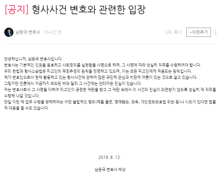 그러자 남윤국 변호사가 자신의 블로그에 입장문을 발표하고 법적대응을 시사했는데요.